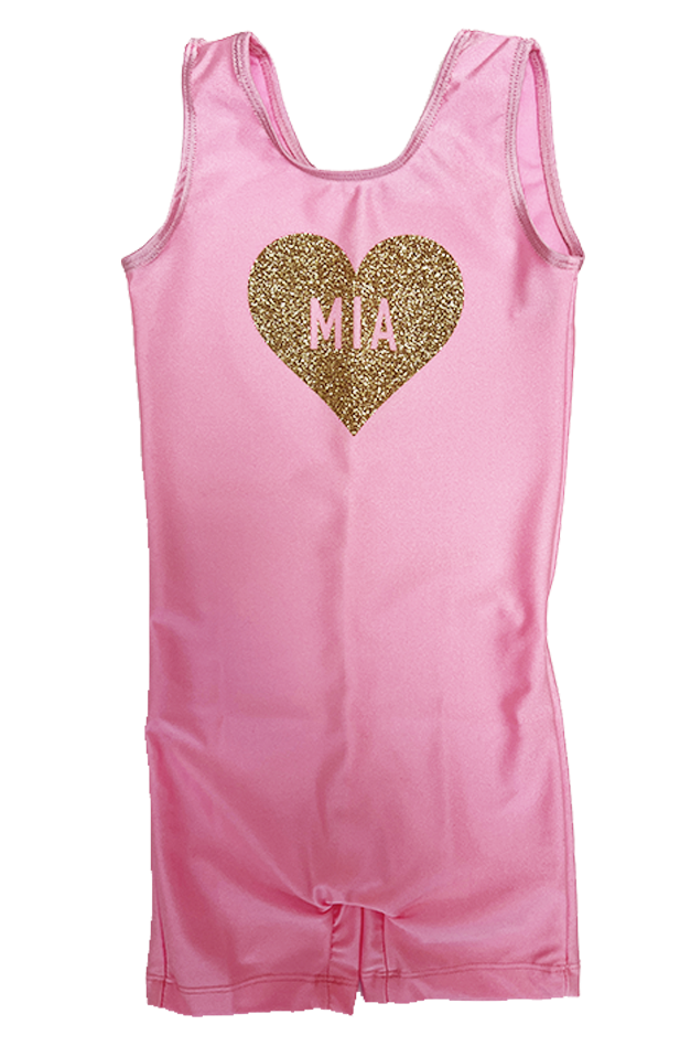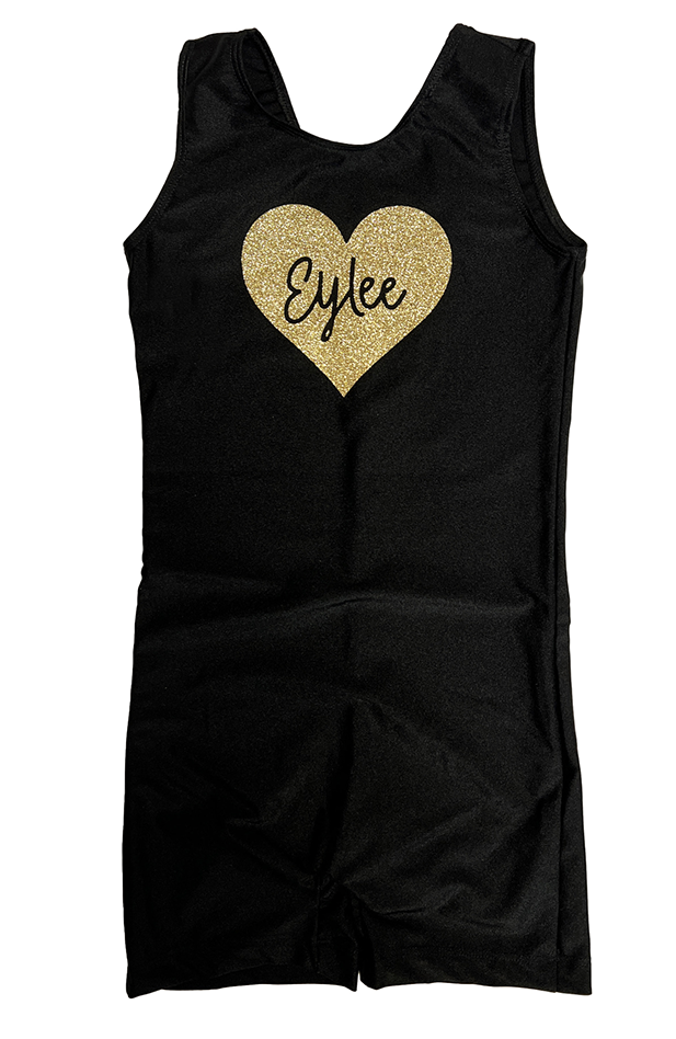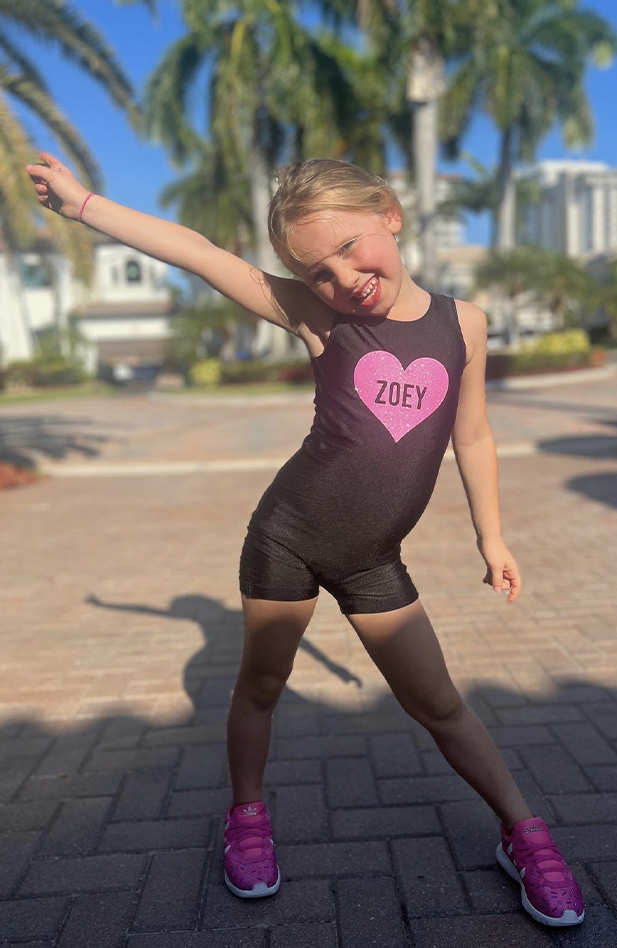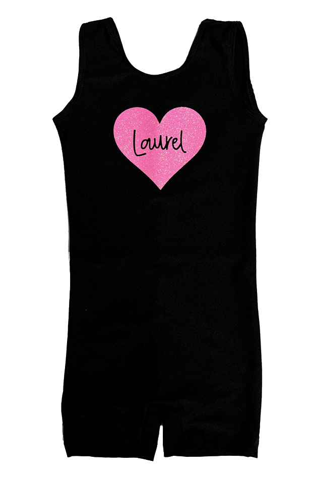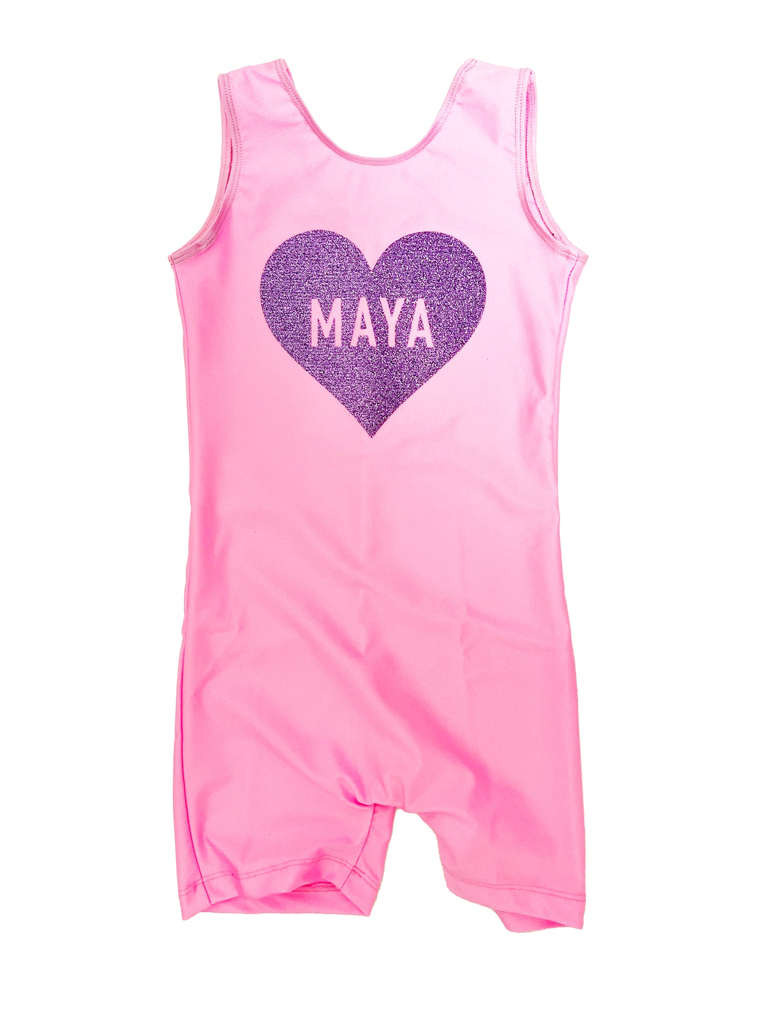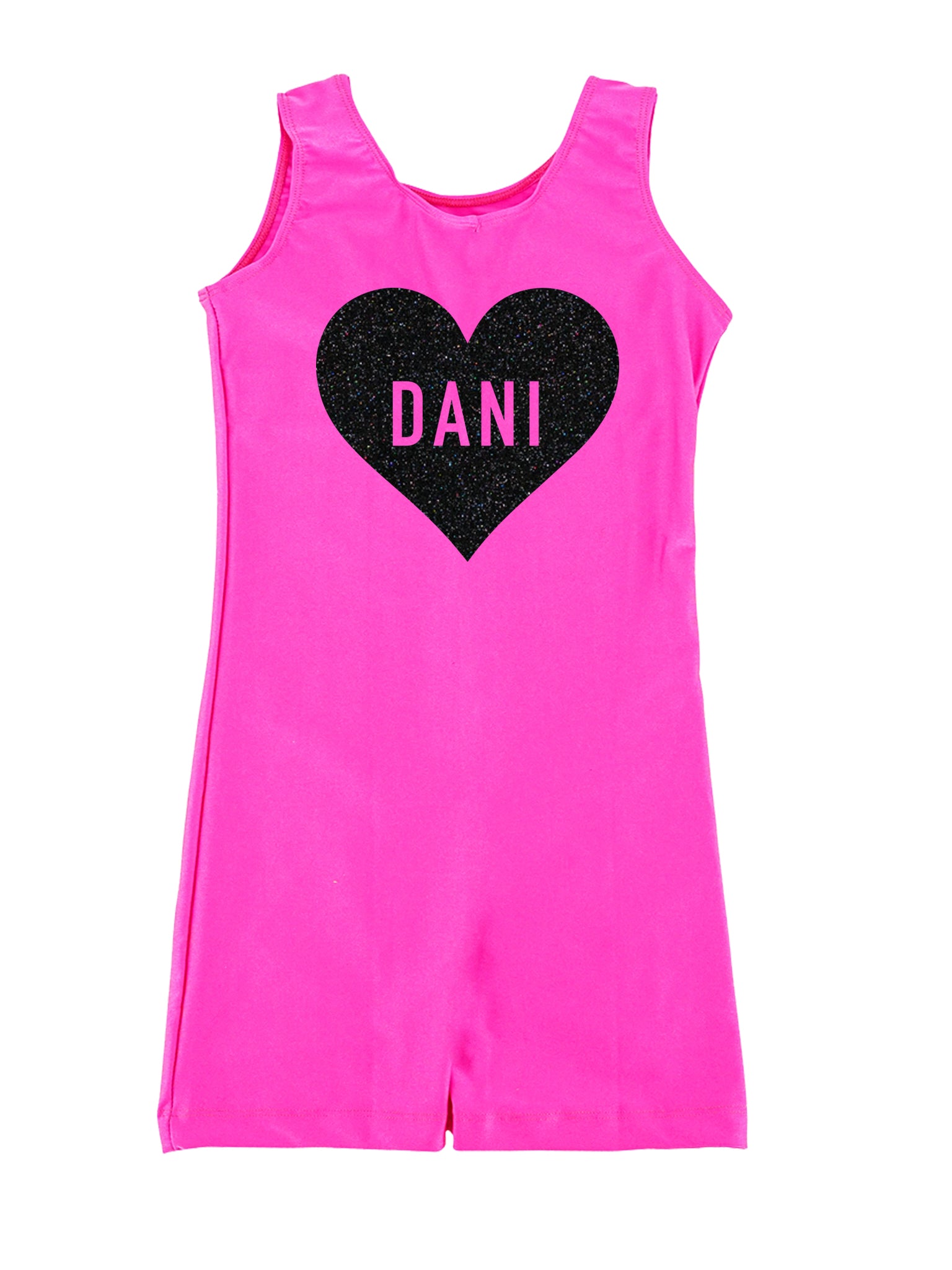 Meet Dani. One of our best-selling personalized designs. Show your mini some love by ordering a custom leotard with her name cut out of a heart. Little and big girls both love this style, no one can resist this sweet design.